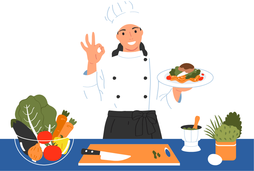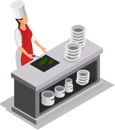 飲食物調理:食材の仕込み、盛り付け、加熱調理、非加熱調理、等